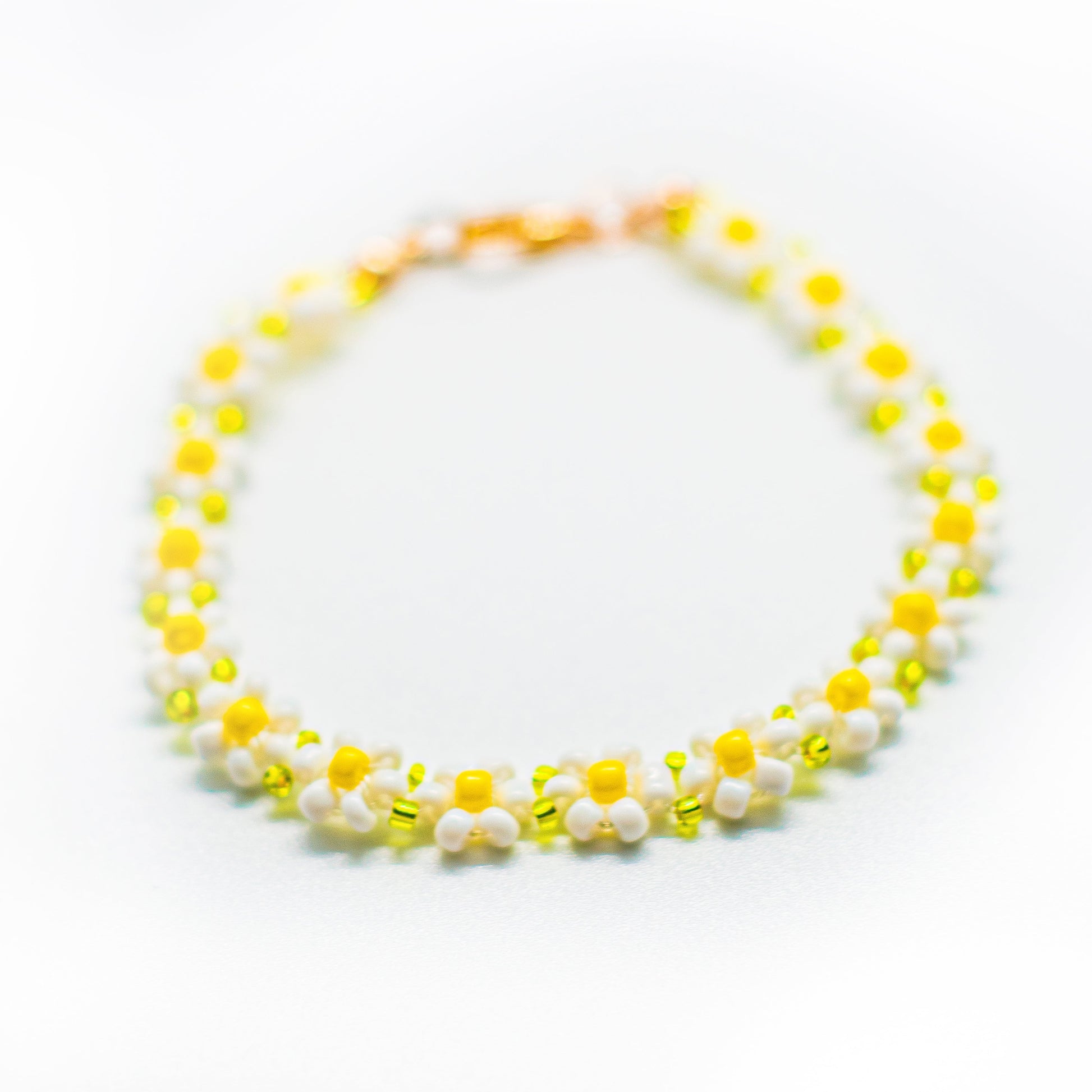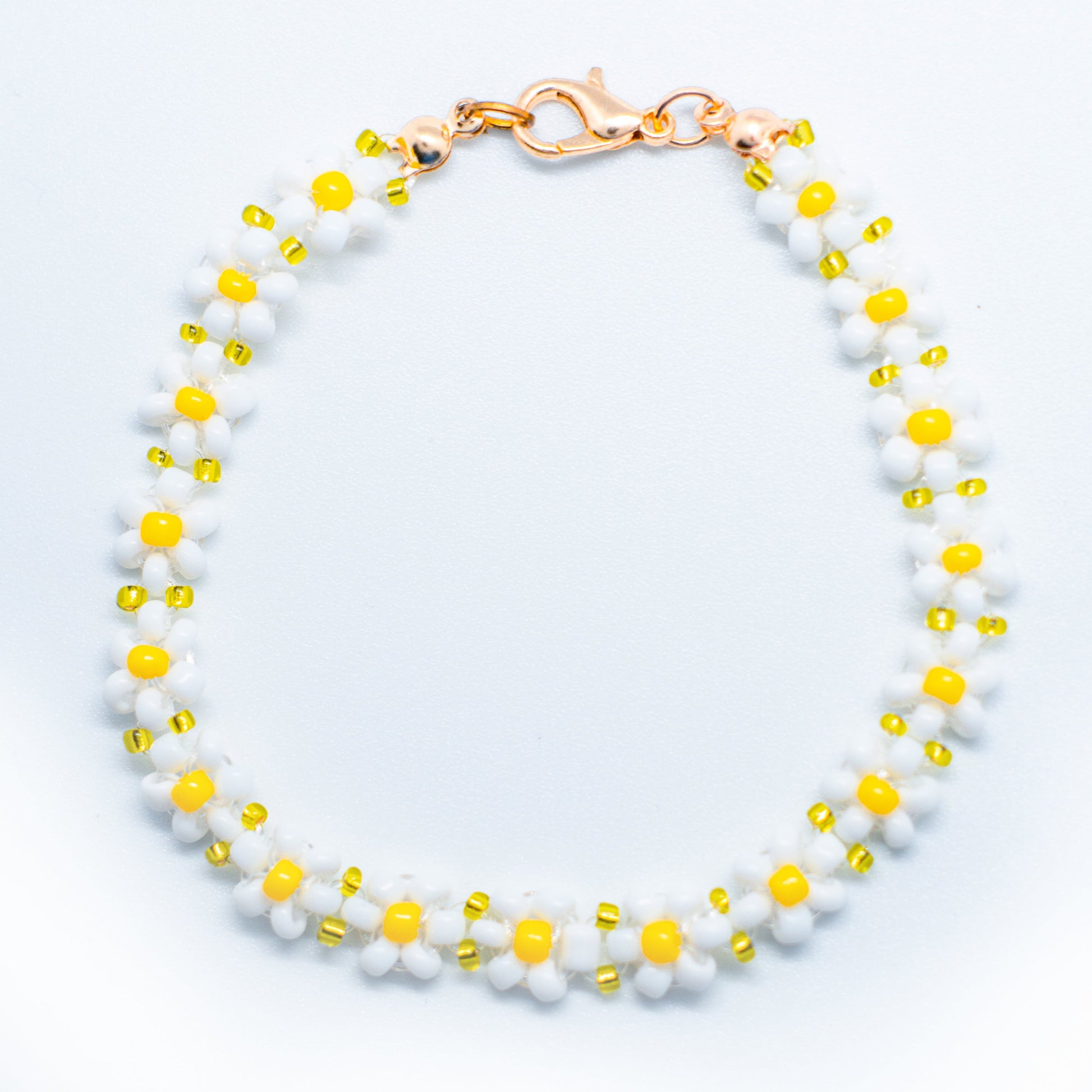 Bright, playful, and full of sunshine — this bracelet features a chain of tiny daisy blossoms, each handmade with crisp white petals and cheerful yellow centers. Golden yellow seed beads in between add a warm shimmer, while the rose gold clasp ties it all together with a soft, feminine finish.