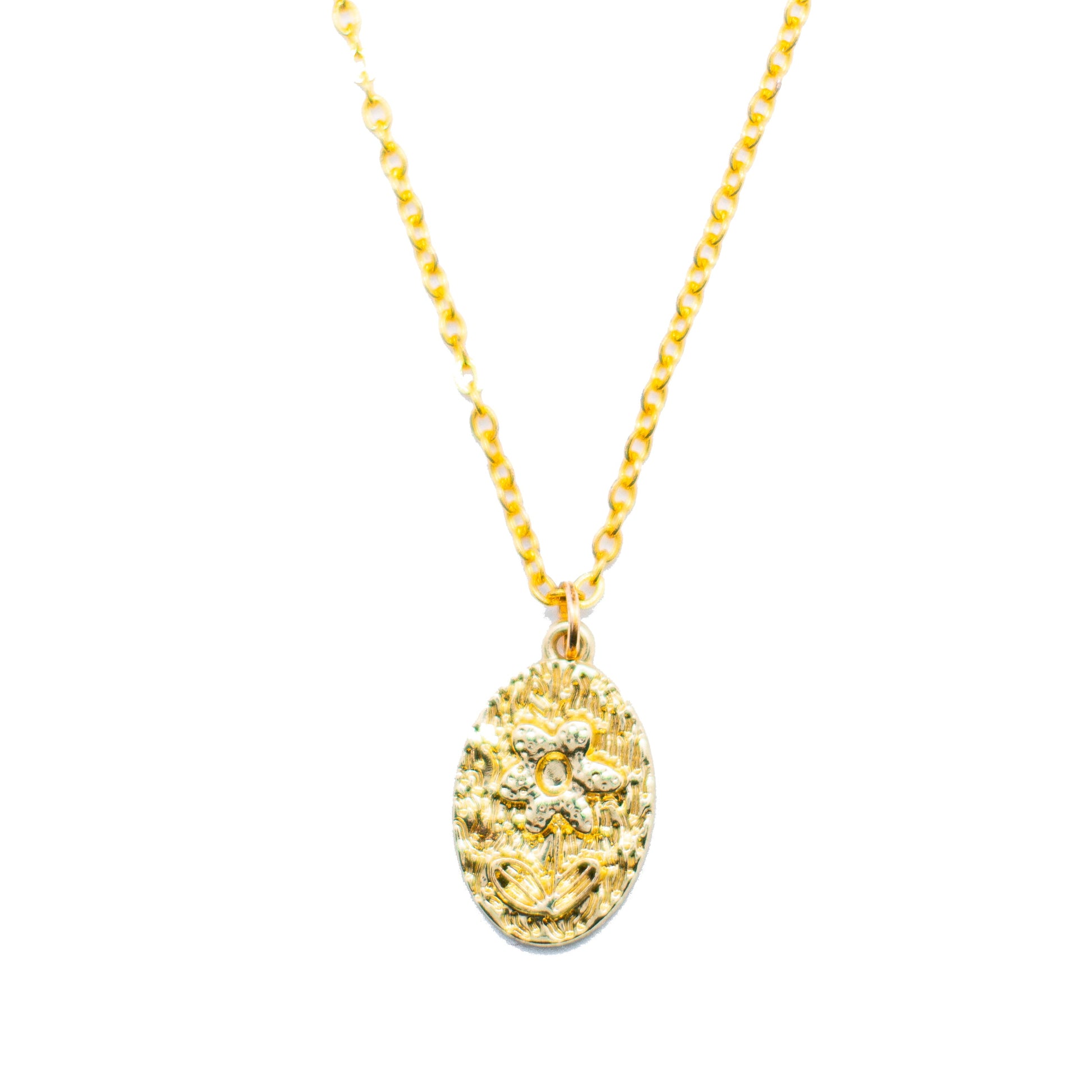 The subtle flower engraving symbolizes natural growth and quiet strength, while the textured finish gives the piece a raw, artisanal charm. Whether paired with everyday outfits or layered with other chains, this necklace brings a grounded yet graceful energy to your style.