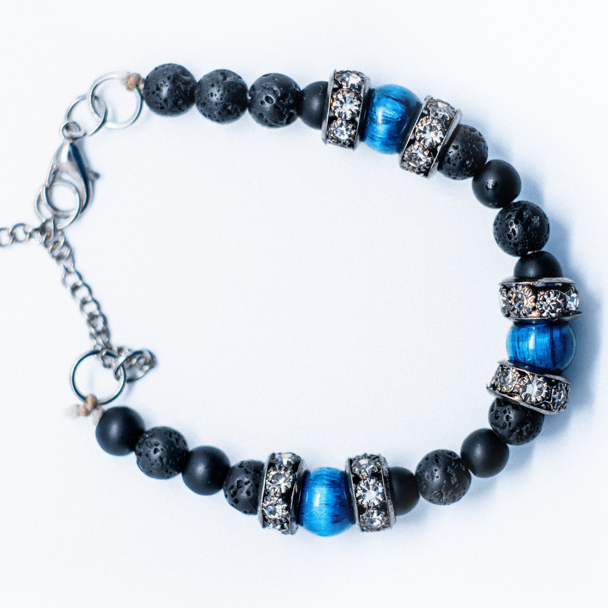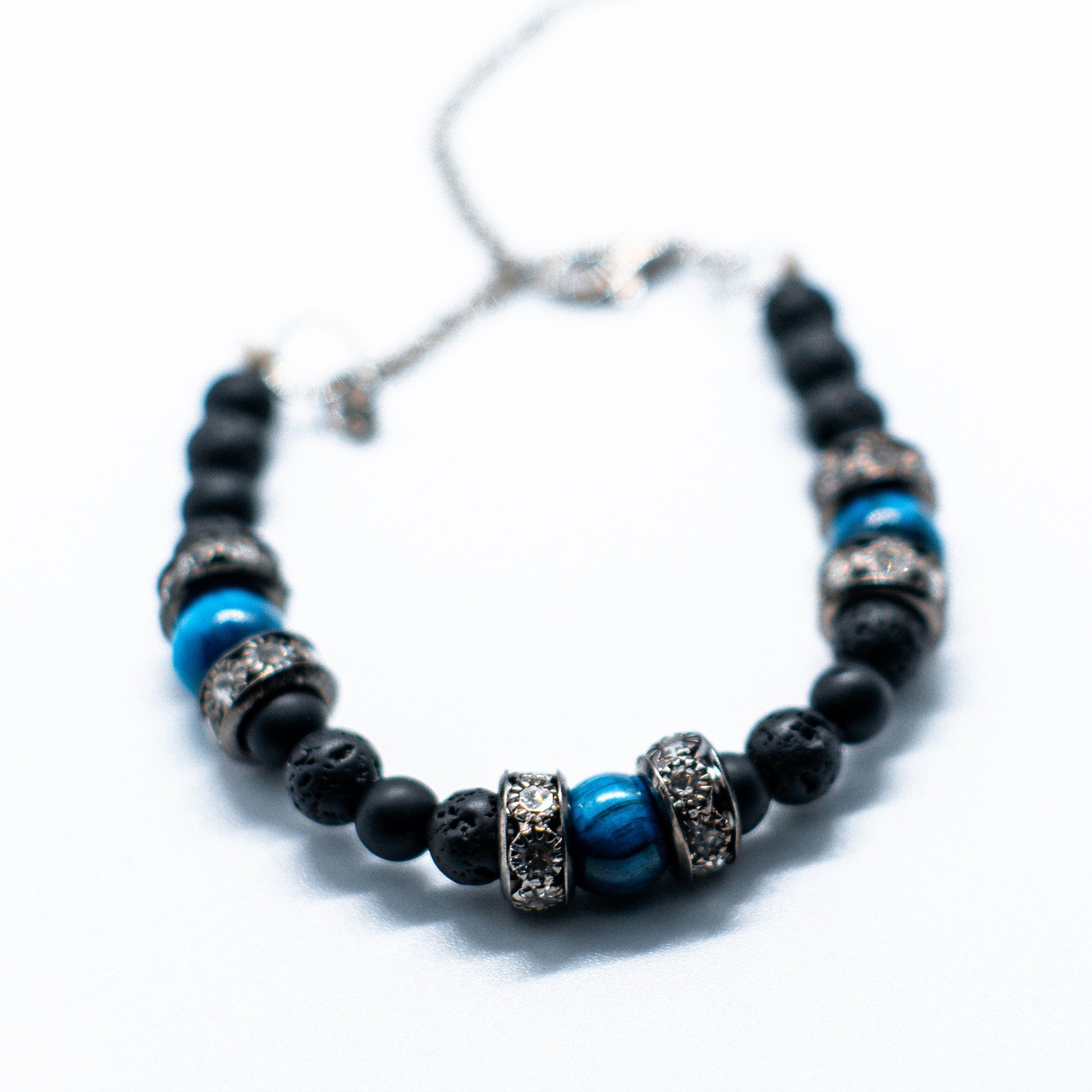 Bold, magnetic, and undeniably masculine — this bracelet strikes a balance between rugged lava rock beads and radiant blue centerpiece stones. Framed with gunmetal-toned crystal spacers and matte black accents, it’s a piece designed for confident men who aren’t afraid to show style with edge.